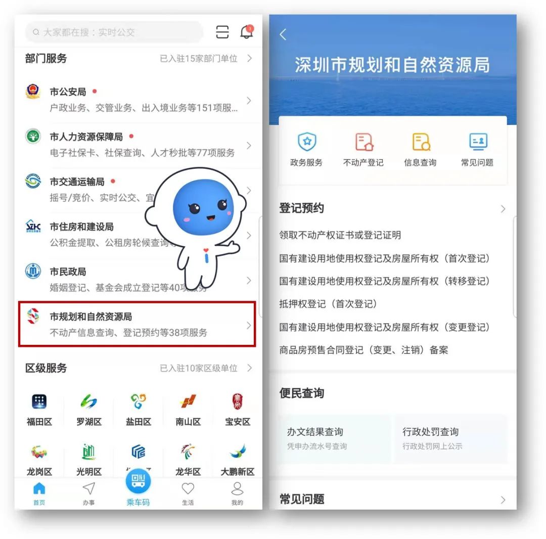 1.在“i深圳”首页下滑至部门服务,进入市规划和自然资源局。