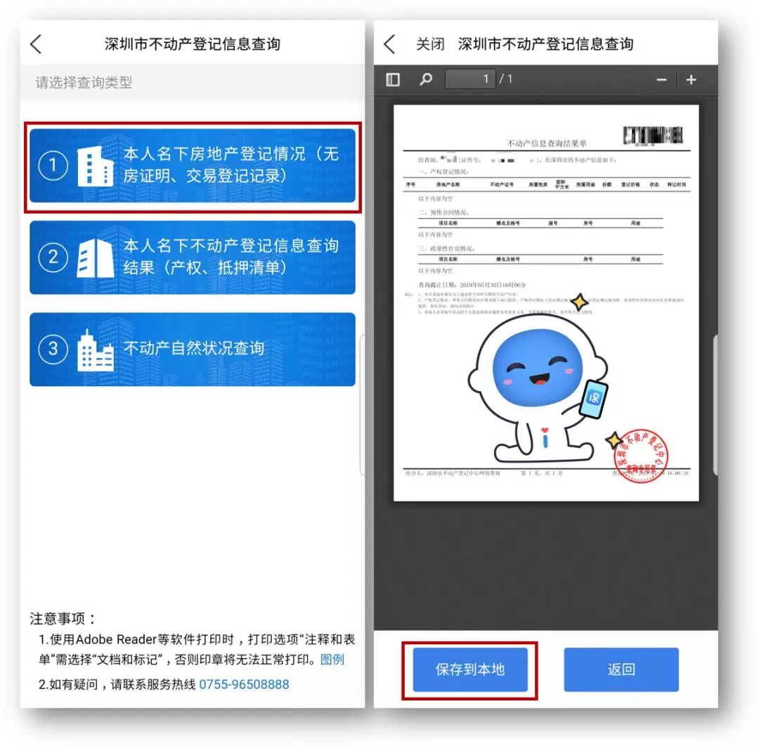 3、选择查询类型一:“本人名下房地产登记情况”,即可保存“无房证明”电子版。