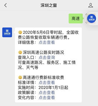 微信搜索或扫描文末二维码,关注【深圳之窗】公众号,对话框发送关键词【高速】,获取广东高速执行新收费标准最新消息,还可查询高速实时路况;发送关键词【违章】可获取深圳交通违章处理入口等相关信息。