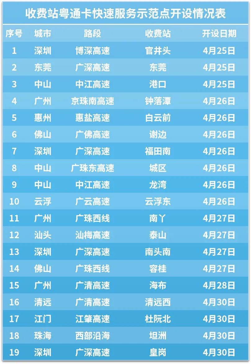 首批19个收费站粤通卡快速服务示范点将在4月30日前全部对外营业。