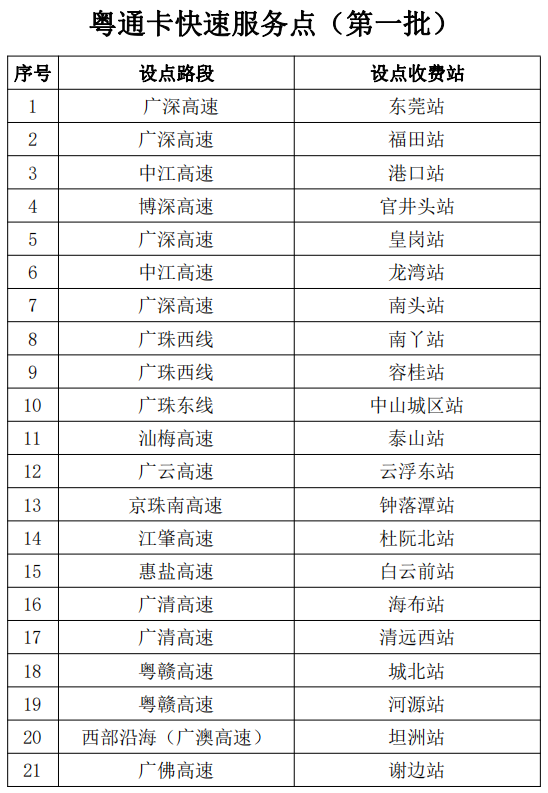 粤通卡运营单位联合电服公司与路段经营单位联手推出了第一批共21个收费站粤通卡快速服务示范点,于5月1日起全部对外营业。车主可现场办理电子标签恢复、更换、粤通卡更换等业务,解决高速公路行车中突发的电子标签电量不足、脱落、粤通卡损坏等意外状况,更好地保障客户顺利出行。
