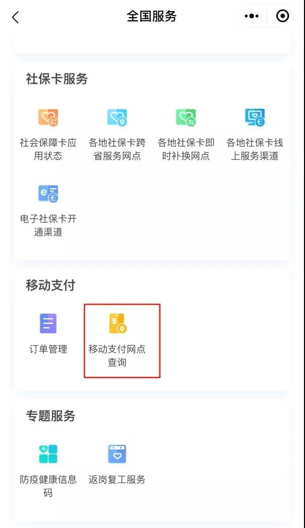 打开电子社保卡中的“全国服务”—“更多”—“移动支付网点”,即可查询。