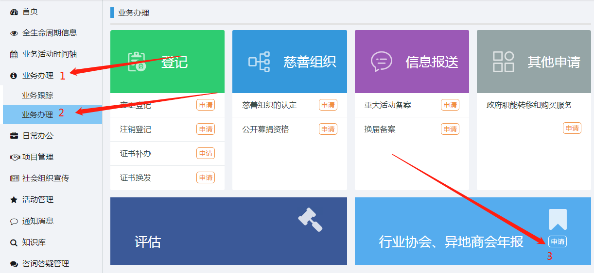5、开始填报:点击工作平台左侧“业务办理”按键,然后点击右下角“申请”按键即可进入年报申报界面。