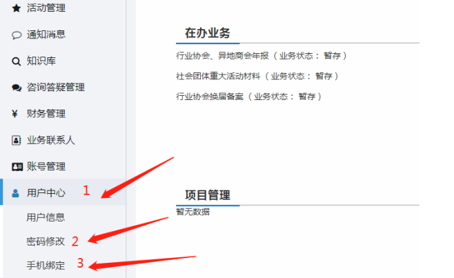 4、修改密码及绑定手机:登录系统后请点工作平台左侧“用户中心”和“手机绑定”进行操作。