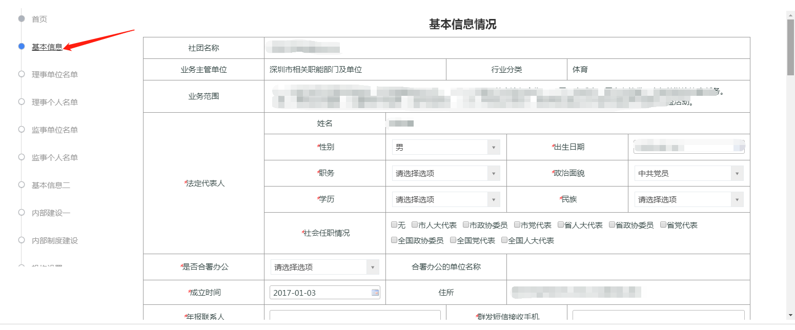 请认真、如实的填写本社会组织的信息,“社团名称”、“住所”、“法定代表人”等信息均为登记事项,由系统直接从登记系统导出无法进行修改,如这类无法修改的信息与实际情况不相符的,请联系我局登记处进行变更后,这类信息才会修改。其中“理事人数”无需填写,这里的数字将会根据后面的“理事单位”和“理事个人”相加所得。