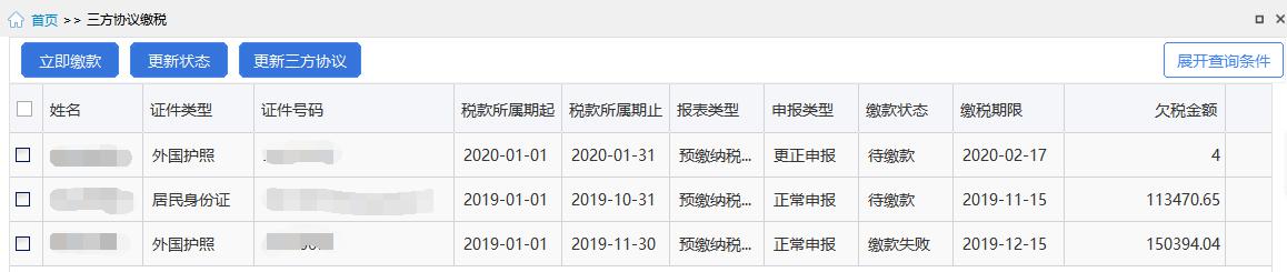申报表申报成功后,点击【税款缴纳】→【三方协议缴税】,界面下方显示欠税相关内容,包括:投资人姓名、证件类型、证件号码、税款所属期起止、申报表类型、申报类型、缴款状态、缴款期限、欠税金额、个人三方协议账户。