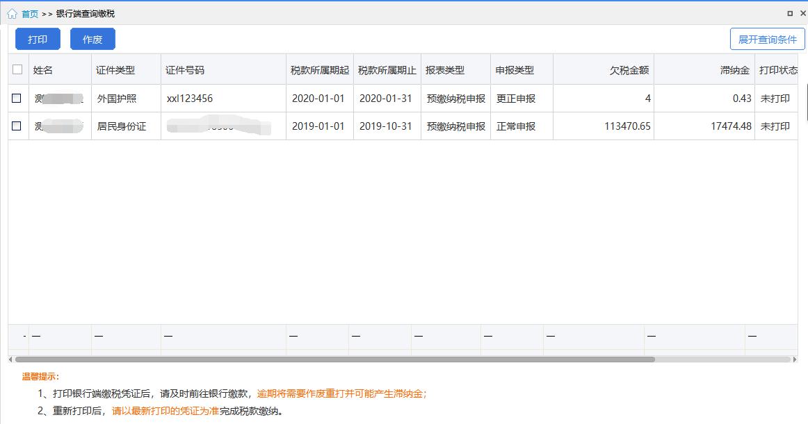 选择投资人待缴税记录后,点击【打印】,携带打印出来的银行端查询缴税凭证在凭证上注明的限缴期限前至商业银行柜台进行缴款,逾期将需要作废重新打印并可能产生滞纳金。若需要重新打印,点击【作废】,作废成功后,状态变更为未打印,重新点击【打印】,携带最新银行端查询缴税凭证至银行缴款。