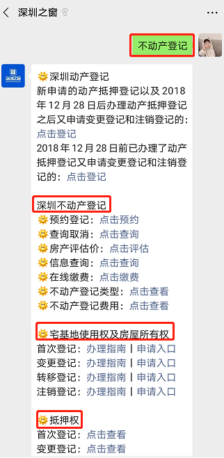 微信搜索关注【深圳之窗】公众号,后台回复关键词【不动产登记】可获取深圳宅基地使用权及房屋所有权首次登记、变更登记、转移登记及注销登记等办理入口及相关指南。