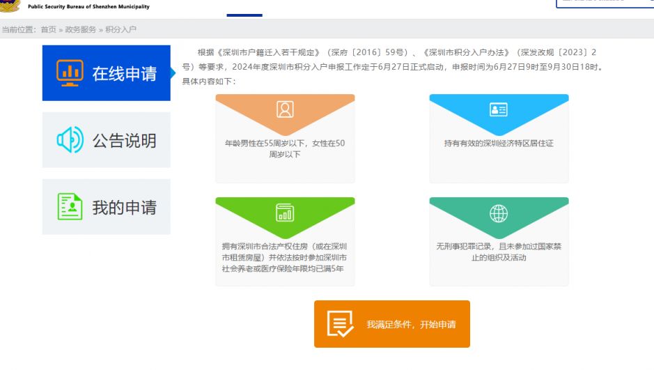 申请人进入深圳市公安局官网——个人业务办理——"市外迁入-积分入户"申请入口(https://msjw.ga.sz.gov.cn/hzjfrh/app/com/apply/blxz),左侧【在线申请】——点击【我满足条件,开始申请】