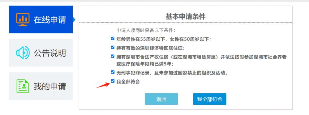 符合申请条件的市民,点击勾选【全部符合】后登录,然后按照系统步骤提交申请信息