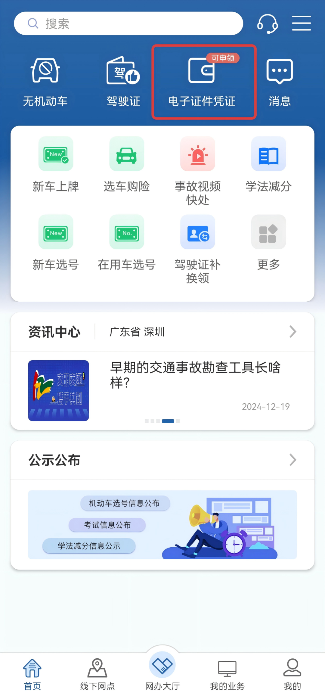 “交管12123”APP → 首页上方【电子证件凭证】 → 电子证件 → 电子驾驶证 → 申领 → 提交申请 → 通过审核即为申领成功。
