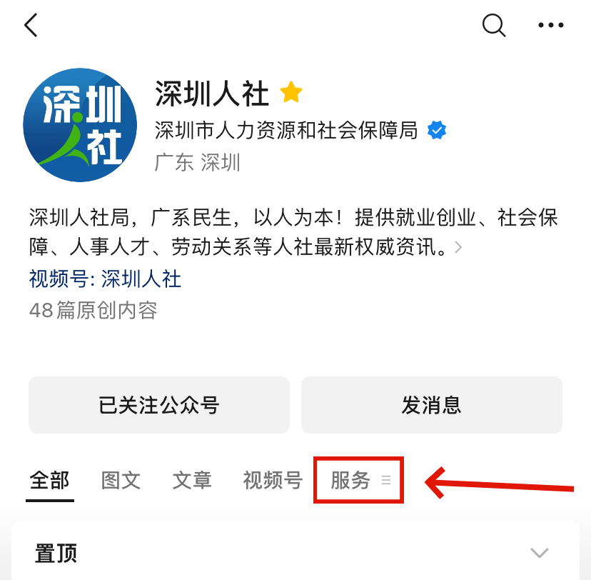 ① 关注“深圳人社”微信公众号,选择“服务”。