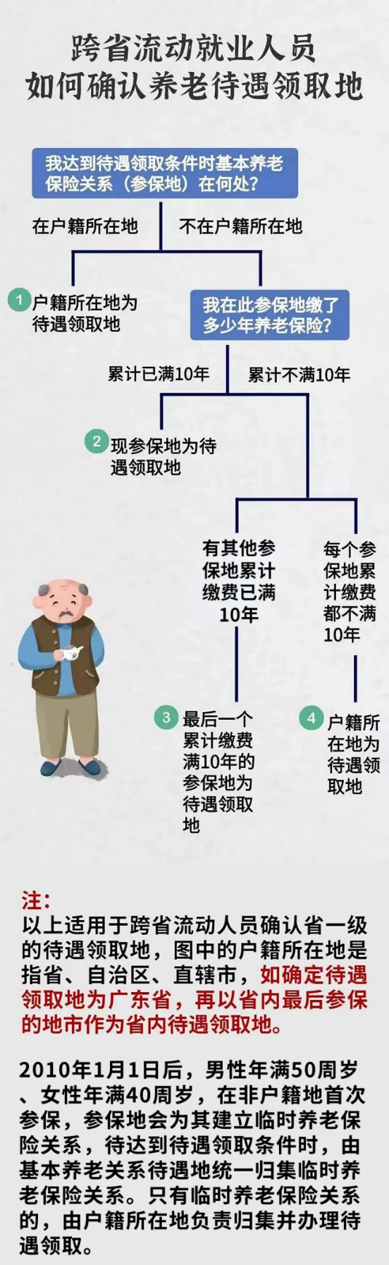 流动就业人员请注意:如果是省内流动就业人员,省内的最后参保地为待遇领取地;如果是跨省流动就业人员,可参考下图进行判断: