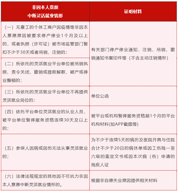 依据《广东省灵活就业人员参加失业保险办法》第十二条规定了六条“非因本人意愿中断灵活就业”情形,建议大家对照情形准备具体的申请材料。