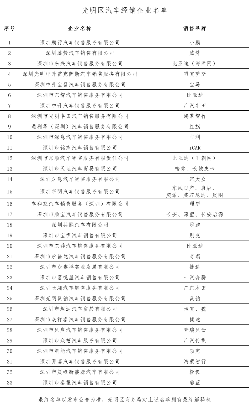 2025深圳光明区汽车欢乐购消费补贴活动汽车经销企业名单