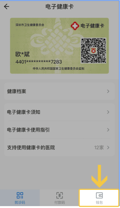 1、登录健康深圳APP(下载入口见文末提示),进入电子健康卡页面,点击【钱包】