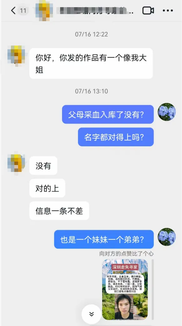 今年7月9日,“蓝雪”再次为黄凤如在抖音上发布了一条视频。令人惊喜的是,短短一个星期后,“蓝雪”就收到了一条私信:“你好,你发的作品(寻亲视频)有一个很像我大姐。”