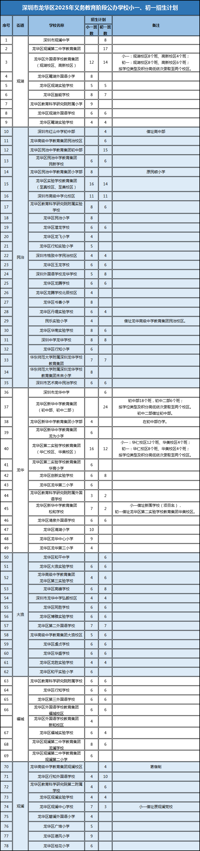 深圳龙华区2025年秋季学期公办学校小一、初一招生计划